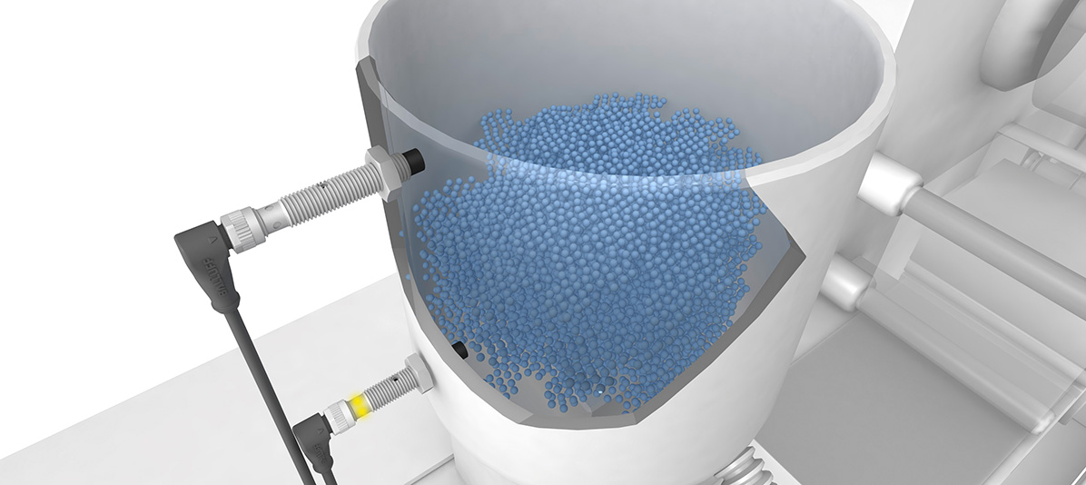 Aby se předešlo výpadkům výroby z důvodu nedostatku materiálu nebo přeplnění, lze malé, nevestavné senzory M8 namontovat na dno nebo na horní část nádoby a ušetřit tak místo.
