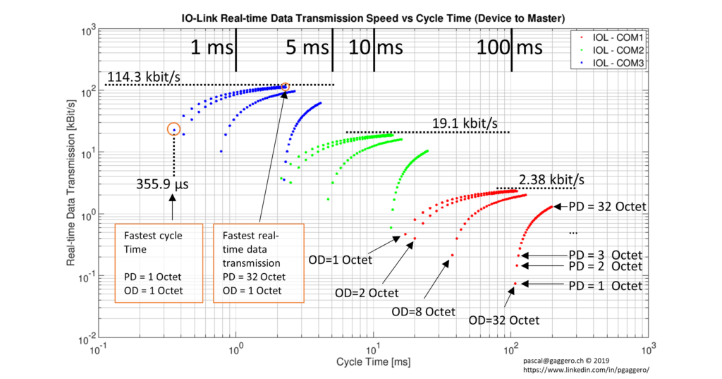 In diesem Artikel untersuchen wir die Zykluszeit von IO-Link, die auf der Version 1.1.3 basiert. Dieses Protokoll ist für die Echtzeitkommunikation konzipiert. Daher wird garantiert, dass ein Teil des Datenstroms innerhalb eines bestimmten Zeitrahmens, der „Zykluszeit“, ankommt. Diese Daten werden als „Prozessdaten“ (PD) bezeichnet. Neben den zyklischen Daten sieht das Protokoll auch die Möglichkeit vor, sogenannte „On-Demand-Daten“ (OD) zu übertragen. Letztere werden azyklisch und ohne jede zeitliche Regelmäßigkeit ausgetauscht. Sie enthalten typischerweise Konfigurations-, Wartungs- und Ereignisinformationen. Sie alle sind für den Benutzer nicht zeitkritisch (sollen es auch nicht sein). Darüber hinaus benötigt IO-Link wie jedes Kommunikationsprotokoll eine geringe Menge an Overhead-Daten, um den Kommunikationskanal zu verwalten. Da die Geschwindigkeit, oder besser gesagt, die Zykluszeit nur für PD kritisch ist, betrachten wir nur die Menge der PD-übertragenen Daten pro Sekunde als unsere Echtzeit-Bandbreite, ausgedrückt in kbyte/s (d.h. PD-Menge/Sekunde).