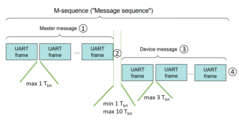 Für die Berechnung der verdrahteten IO-Link-Zykluszeit gehen wir von einem „Worst-Case“-Szenario aus, was bedeutet, dass wir jedes Mal, wenn die Norm Wertebereiche angibt, den größten Wert genommen haben. Wie in Bild 2 zu sehen ist, beträgt die Zeit zwischen den UART-Frames der Nachricht des Masters und des Geräts 1 Tbit * und 3 Tbit. Die für den Wechsel der Kommunikationsrichtung erforderliche Wartezeit kann bis zu 10 Tbit betragen.