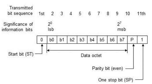 Jeder UART-Frame enthält 8 Bit Nutzdaten und 3 Bit Overhead (START, PARITY und STOP). Somit erfordert die Übertragung von 8 Bits tatsächlich 11 Tbit Zeit.