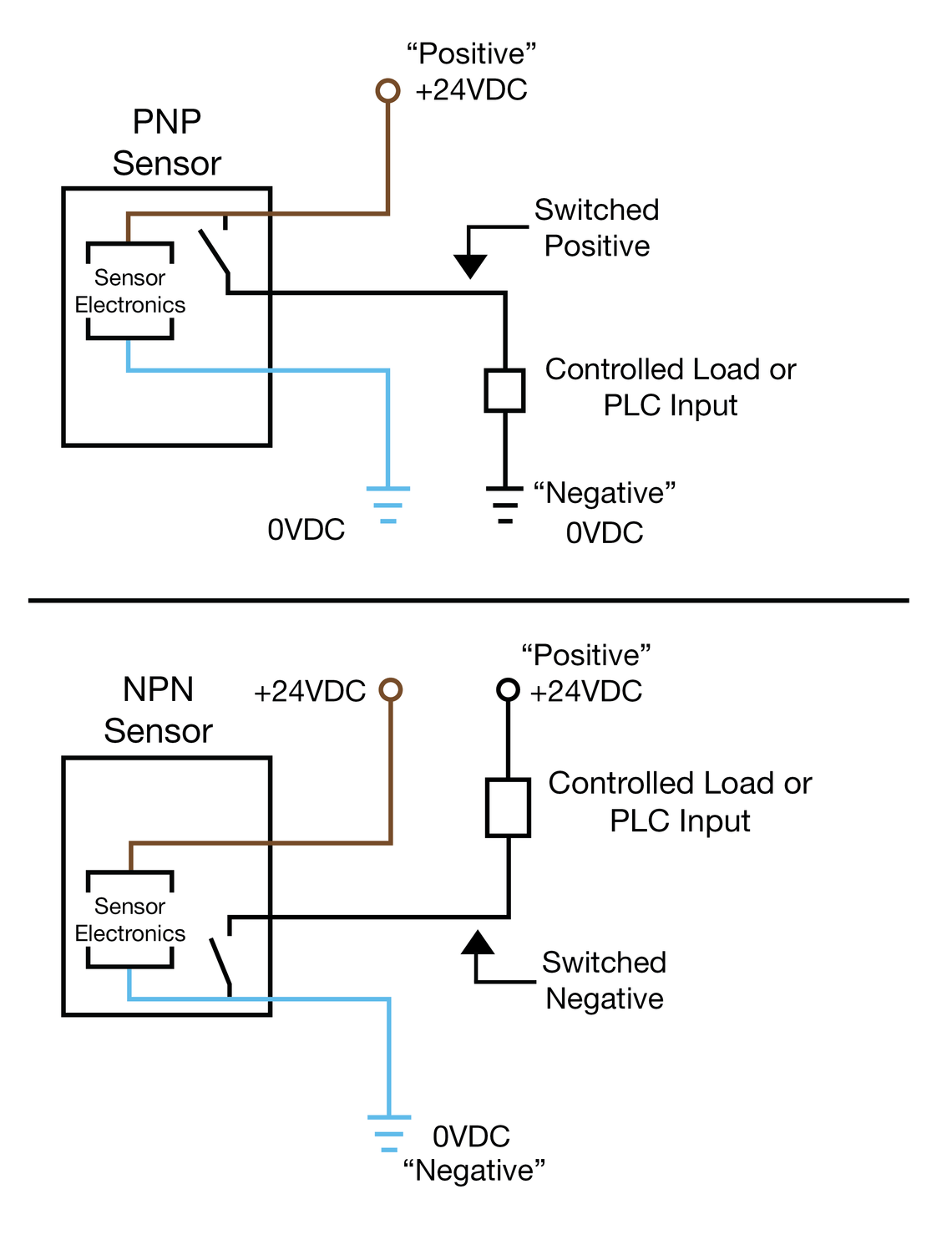In der Automatisierungstechnik gibt es 2 unterschiedliche Technologien beim Einsatz von Sensoren. Sehr oft werden in der Automatisierung 3-Draht Sensoren eingesetzt. Sowohl bei induktiven Näherungsschaltern, optischen Sensoren und auch kapazitiven schaltenden Sensoren gibt es 2 unterschiedliche Ausprägungen: PNP-Sensoren und NPN-Sensoren. Hier ist eine einfache Möglichkeit, sich zu merken, wie man einen 3-adrigen PNP- oder NPN-Sensor verdrahtet: