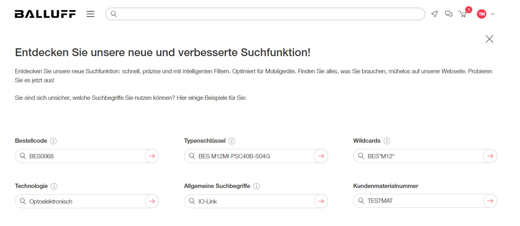 Sie möchten die von Ihnen benötigten Balluff Komponenten einfach und schnell mit Ihrer persönlichen internen Materialnummer suchen und finden? Kein Problem, egal ob über die Suche auf unserer Website oder direkt im Webshop, sofern Ihre Kundenmaterialnummer bei uns gepflegt ist, finden Sie ganz einfach das passende Balluff Produkt mit der Eingabe Ihrer internen Bestellnummer.