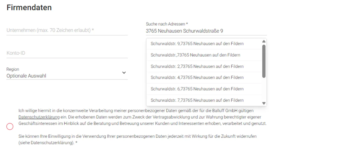 Mit der Autocomplete-Funktion können Sie Adressdaten schneller und effizienter eingeben. Die automatische Vervollständigung schlägt im Registrierungsprozess und in der My Balluff Adressverwaltung passende Adressen vor, sobald Sie beginnen, Ihre Daten einzutragen. Dadurch werden Eingabefehler reduziert und der Prozess insgesamt vereinfacht. Selbstverständlich bleibt die manuelle Eingabe, Anpassung und Korrektur von Adressen weiterhin möglich.