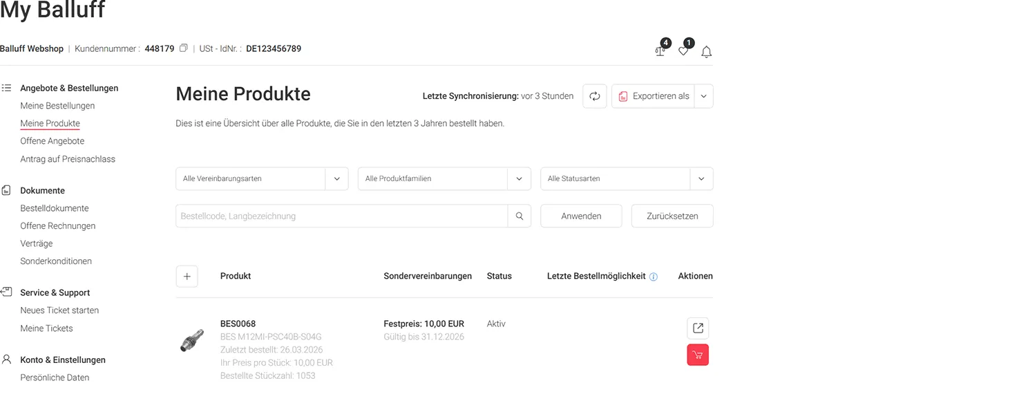 Im neuen Bereich können Sie Ihr persönliches Balluff-Produktportfolio einsehen und verwalten. Hier werden sämtliche Produkte aufgeführt, die Sie in den letzten drei Jahren bestellt haben – alles bequem an einem zentralen Ort. Sie haben zudem die Möglichkeit, weitere Artikel manuell hinzuzufügen. Die Anzeige von Sondervereinbarungen und Lebenszyklusdaten bringen Transparenz. Zur effizienten Handhabung stehen Such-, Filter- und Exportfunktionen zur Verfügung.