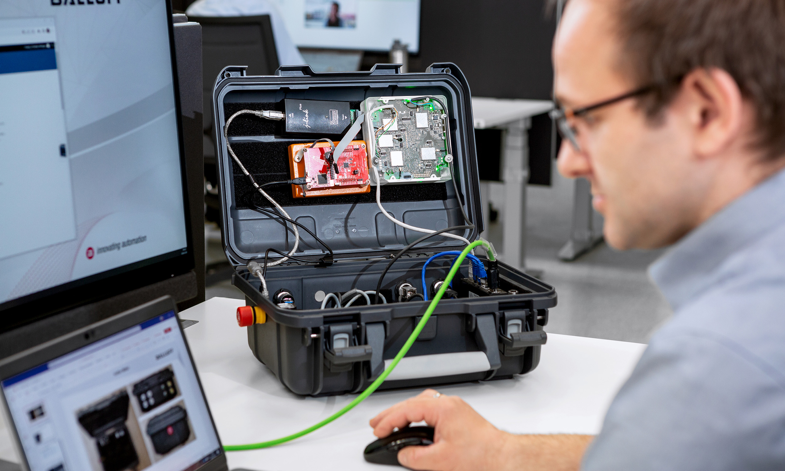 The briefcase is very popular with the whole team: "I often get feedback asking why we haven’t thought of this sooner," says Christian Metzger. One reason for its popularity is the fact that the case does not only solve issues related to the pandemic or efficiency: "Before we had the case, our developers would assemble their setups themselves. That means choosing components, ordering, unpacking, building — and this process makes it easy to get lost in the details." Now, even highly specialized setups are only a few clicks away, since the case can be individually configured and ordered by developers throughout the whole company on the internal Balluff Marketplace.