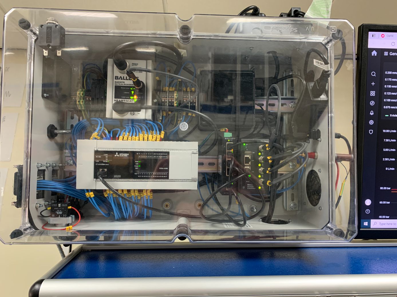 The Balluff Condition Monitoring Tool Kit –CMTK was installed along with Condition Monitoring BCM Sensors, IO-Link Signal Converters, IO-Link Power Supply and an Ethernet IP IO-Link Master onto each teaching rig. Feedback from standard sensors were collated via the IO-Link network by direct connection or by using the Balluff IO-Link Signal Converters into the CMTK via the Ethernet IP IO-Link Master. The metric data was then displayed remotely on large LCD Screens above each training rig using the Grafana Platform generated from the CMTK.