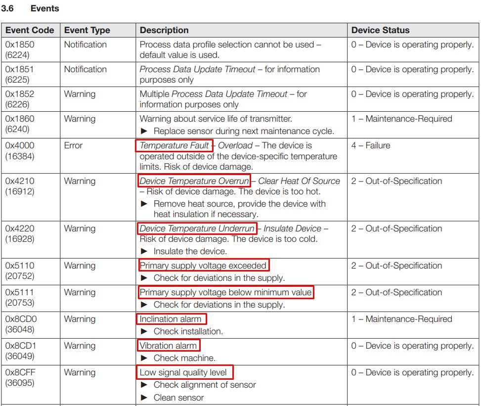 To bring all these components together, let’s look at a photoelectric IO-Link sensor with internal condition monitoring functions and see what Events are available for it in this device manual screenshot. This device has Events for temperature (both warning and error), voltage, inclination (sensor angle is out of range), vibration, and signal quality (dirty lens).