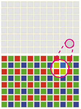 Color sensors use a Bayer color filter, which allows only one basic color to reach each pixel. The missing colors are determined using interpolation of the neighboring pixels. Monochrome sensors are twice as light sensitive as color sensors and lead to a sharper image by acquiring more details within the same number of pixels. For this reason, monochrome sensors are recommended if no color information is needed.