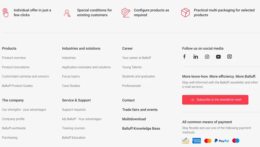 In addition to providing an overview of Balluff's conditions and services, the displayed structure of the website offers a useful guide and numerous quick links to our social media channels and newsletter. Of course, all legally relevant content, such as the legal notice and terms and conditions, is still quickly accessible. The modern color scheme rounds off the optimization.