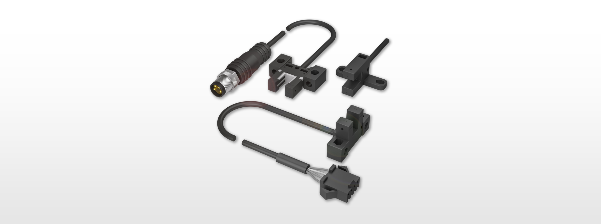 These compact versions are available in six housing shapes to provide the best mounting option for your application, including mounting holes that are perpendicular or parallel to the slot. Each housing shape is available with three types of connectors: M8 4-pin connector, flat 4-pin connector, and PVC cable. Ours is the only miniature fork sensor on the market with an available M8 4-pin connector.