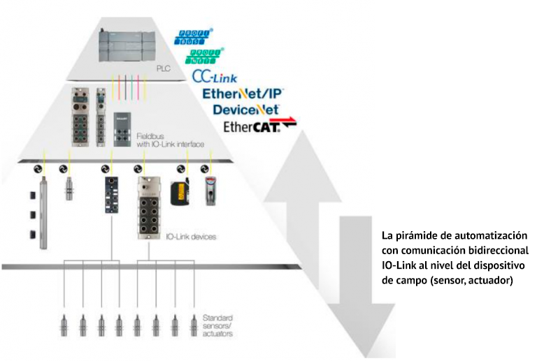 En conclusión, IO-Link permite una relación plug-and-play entre el controlador y los dispositivos en la máquina. Usando datos IO-Link, el controlador puede reconocer y configurar automáticamente un dispositivo esclavo IO-Link que está conectado a su red. Los datos de proceso y diagnóstico proporcionan información continua sobre el funcionamiento y el estado de la máquina hasta un nivel de sensor, el nivel más bajo de la pirámide de automatización.