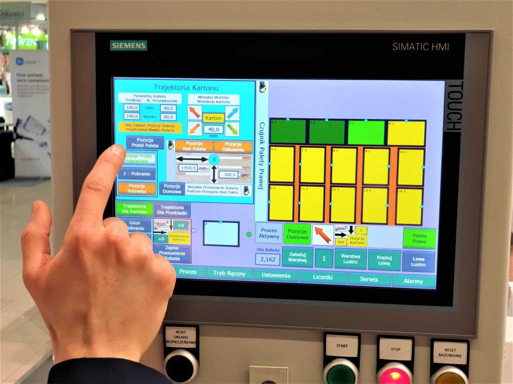 Zdawaliśmy sobie sprawę, że nasza stacja musi być możliwie funkcjonalna, dlatego też postanowiliśmy oprzeć ją na panelu przemysłowym firmy Siemens. Dzięki zaangażowaniu naszych programistów udało się stworzyć do niego program, który pozwala na ustawianie kolejnych referencji dla różnego rodzaju pudełek, czy ułożeń na paletach EURO i paletach przemysłowych. Zastosowanie panelu przemysłowego z interfejsem graficznym pozwala na wykorzystanie wszystkich możliwości sterownika takich jak: wytrzymałość, niezawodność i elastyczność.
