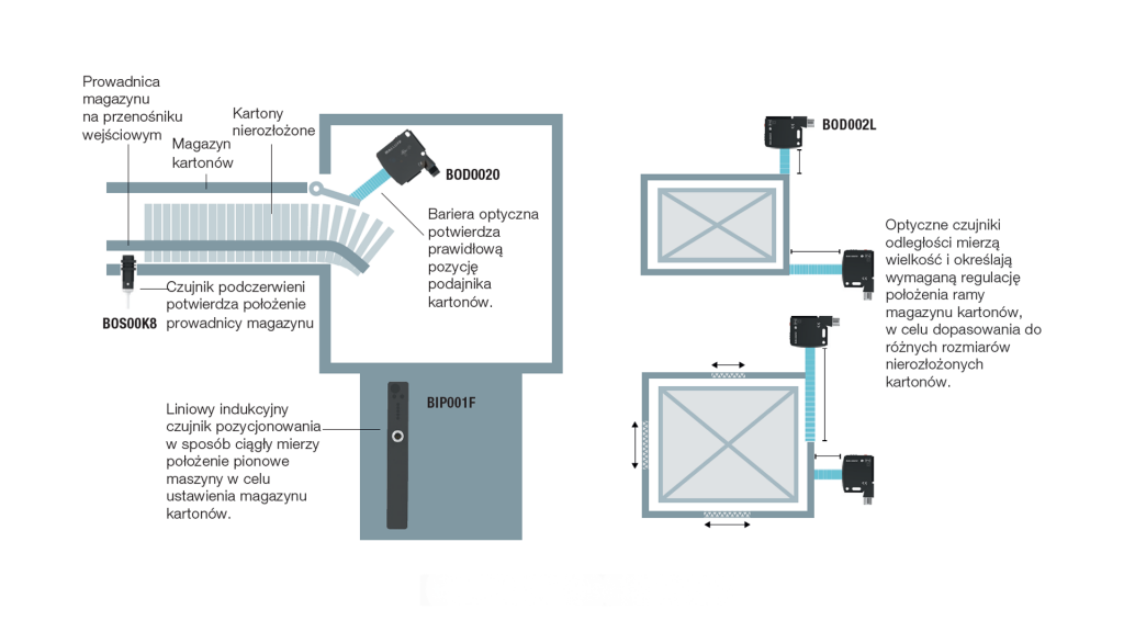 Klient zdecydował się przetestować, a następnie wdrożyć sterowanie za pomocą czujników Balluff na najbardziej krytycznym elemencie – magazynku kartoniarki.