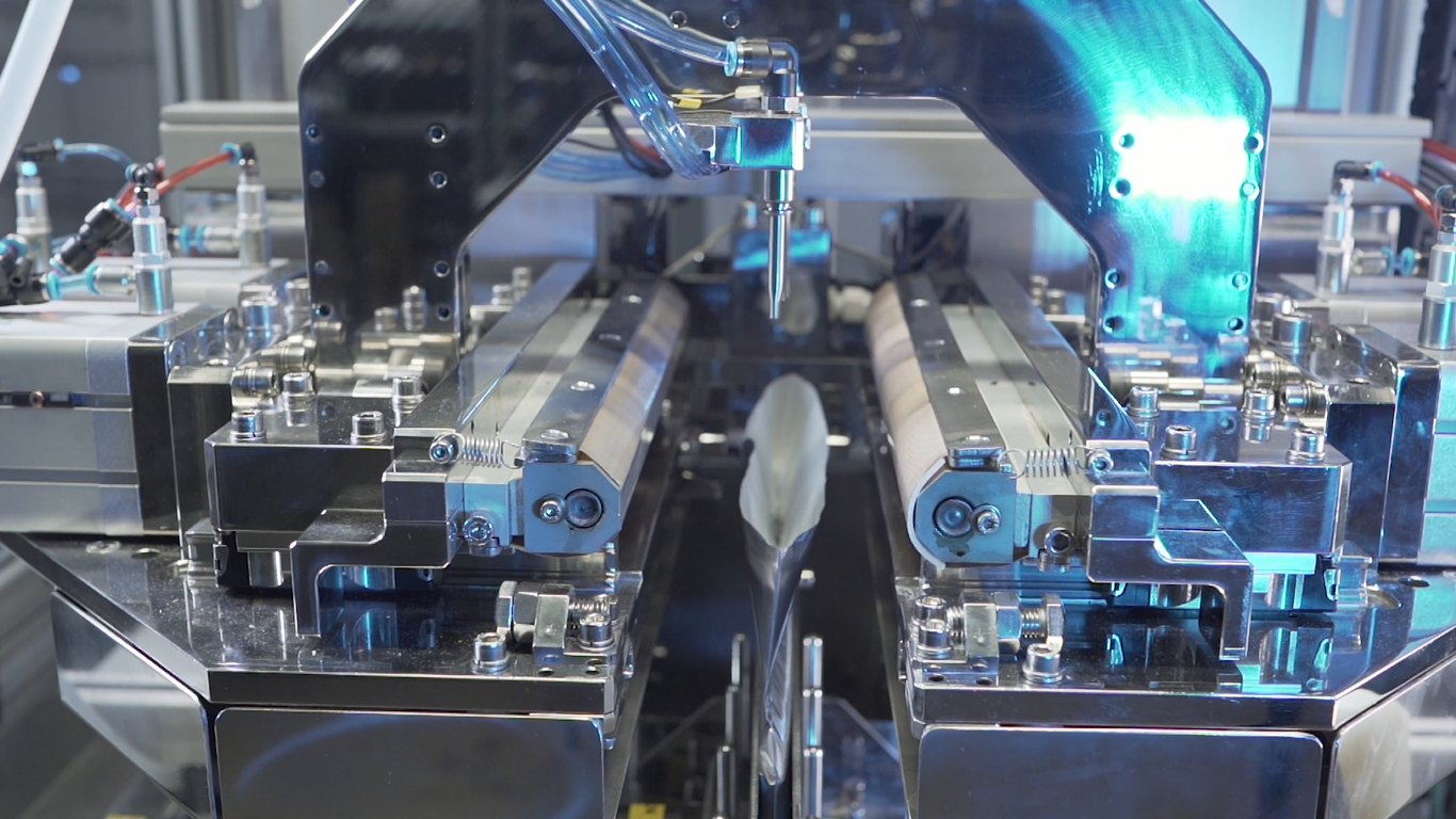 Pusty worek wykonany ze specjalnej folii aluminiowej stworzonej do procesu zgrzewania, trafia najpierw na stanowisko do zgrzewania plastikowego trzpienia i wykonywania przetłoczenia, a następnie jest przekazywany na nasze stanowisko na którym wykonywane są operacje automatycznego: