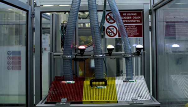 Dla uproszczenia całego procesu zastosowaliśmy technologię IO-Link złożoną z przycisków i lampek. Lampka wskazuje nam jaki kolor ma zaślepka (są ich trzy rodzaje). We wspomnianym sterowniku PLC możemy je dowolnie zaprogramować. Czerwona lampka wskazuje na obecność czerwonej zaślepki w pojemniku. Zmiana koloru (efekt omiatania koloru) danej lampki, sygnalizuje pracę danej nitki transportu i informują, że w danej rurze następuje wydmuch powietrza. Jeśli operator zauważy brak zaślepek w pojemniku, ma możliwość przybliżenia dłoni do konkretnego przycisku i wtedy uruchamia dodatkowy cykl przedmuchu. Zaślepki, które mogły zatrzymać się w pozycji pośredniej, dolatują do pojemnika docelowego.